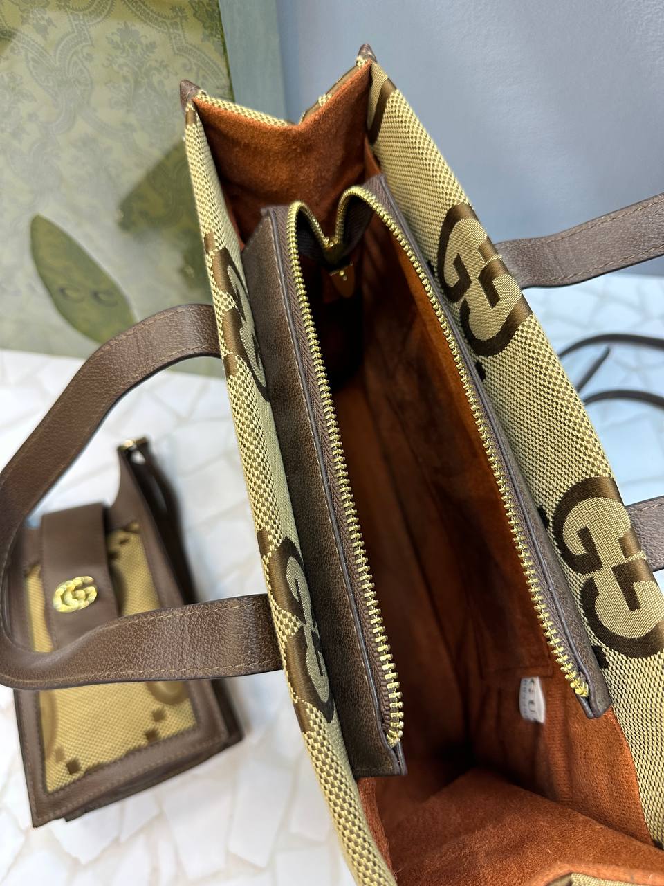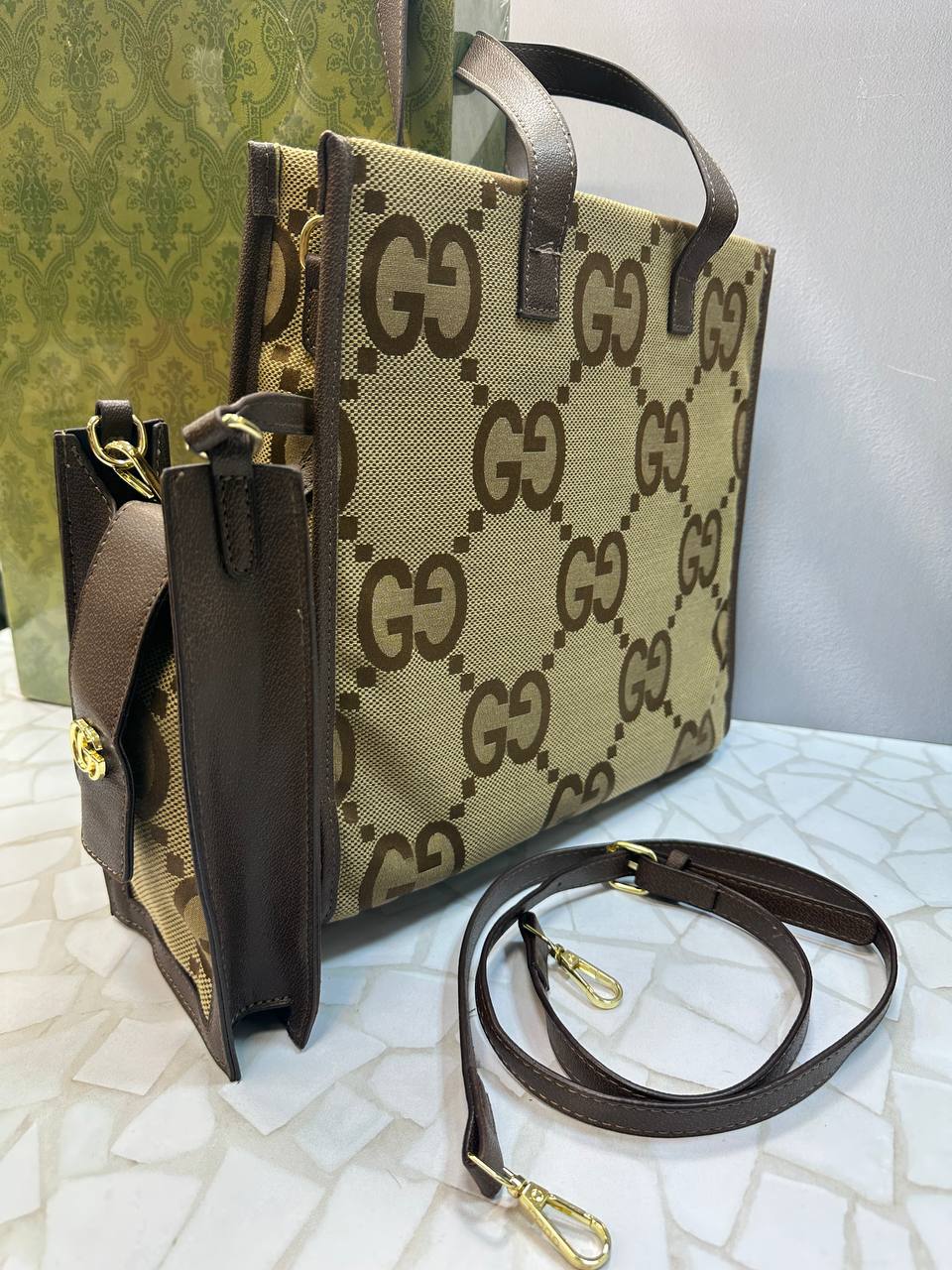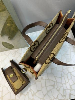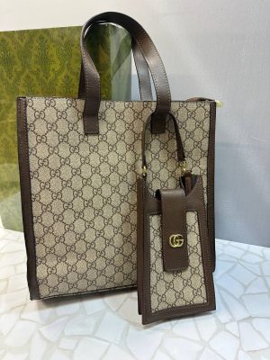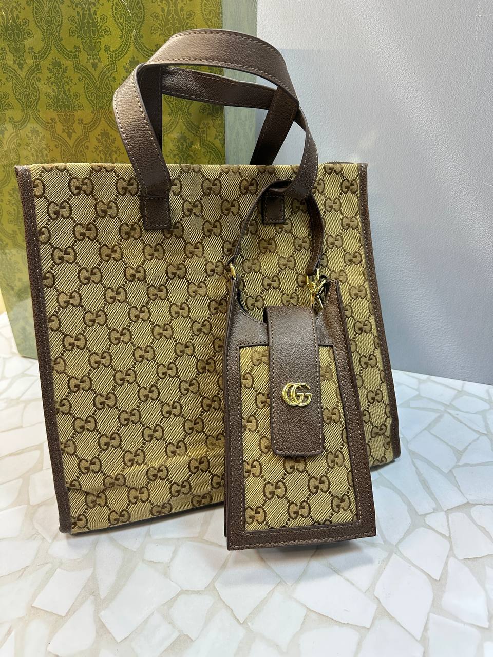 توت بگ زنانه گوچی Gucci دو تکه شامل یک کیف دستی بزرگ و یک کیف موبایل شیک، در رنگ‌های کرم قهوه‌ای، خاکی قهوه‌ای و خاکی قهوه‌ای G بزرگ. طراحی کلاسیک و بادوام، همراه با بسته‌بندی اورجینال. (کد محصول: 108)