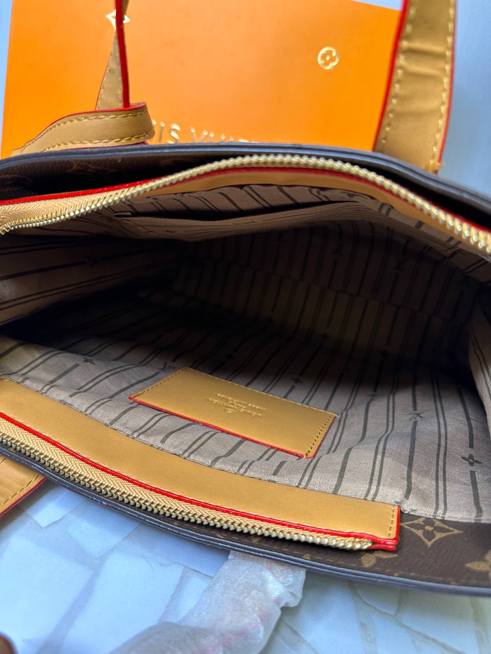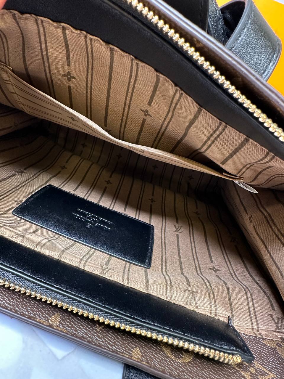 داخل کیف نیز با پارچه لوگودار LV پوشانده شده است که کیفیت بالای آن در نگاه و لمس کاملاً محسوس است. حک شدن لوگوی برند بر روی پارچه داخلی، نشاندهنده دقت و اصالت ساخت کیف است.