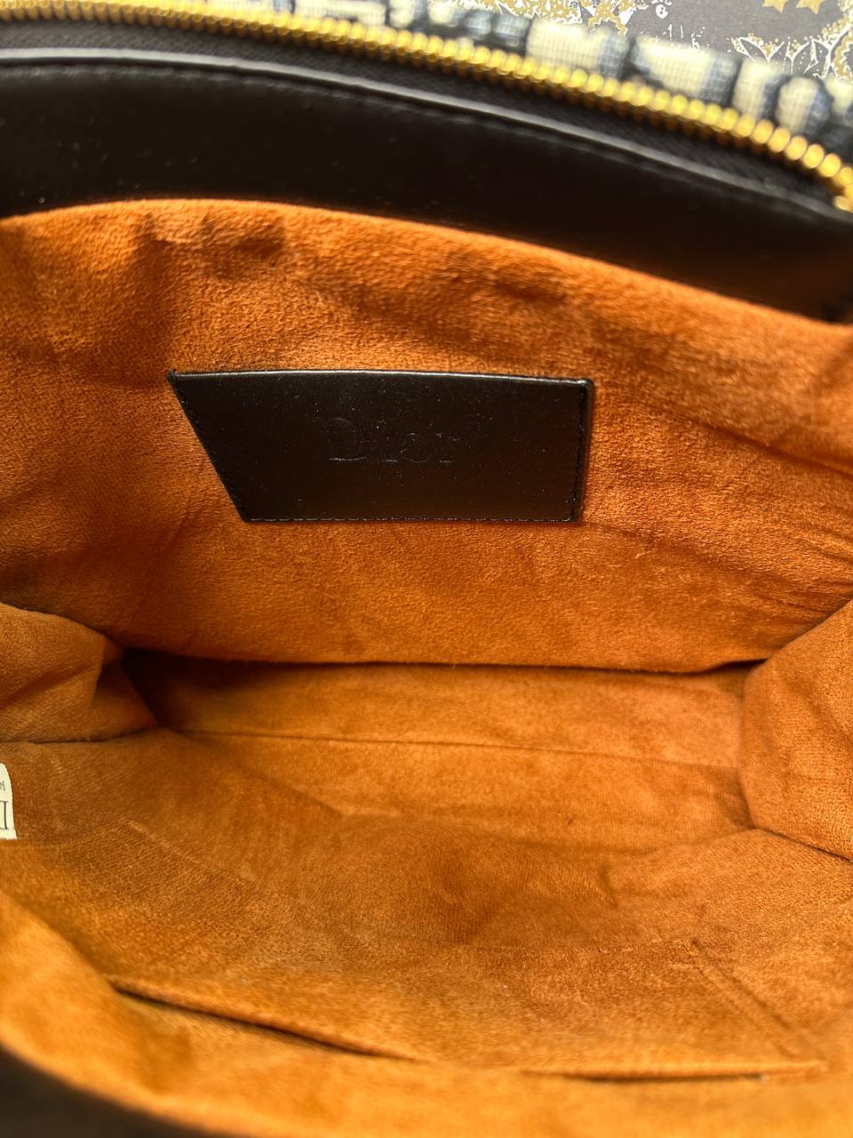 بخش داخلی کیف با پارچه قهوهای طرح جیر پوشش داده شده که علاوه بر کیفیت لمس بالا، جلوهای حرفهای و لوکس به فضای داخلی میدهد. در این قسمت یک جیب کاربردی جاکارتی تعبیه شده است که روی آن قطعه چرم با لوگوی Dior دوخته شده و نشانی از دقت در طراحی جزئیات محسوب میشود.