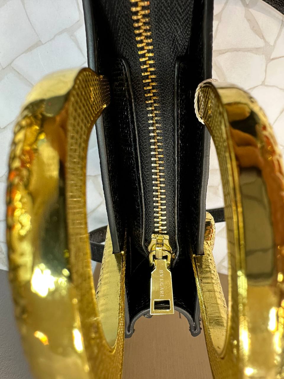 لوگوی طلایی BVLGARI در قسمت بالایی کیف بهصورت برجسته و براق درج شده است.