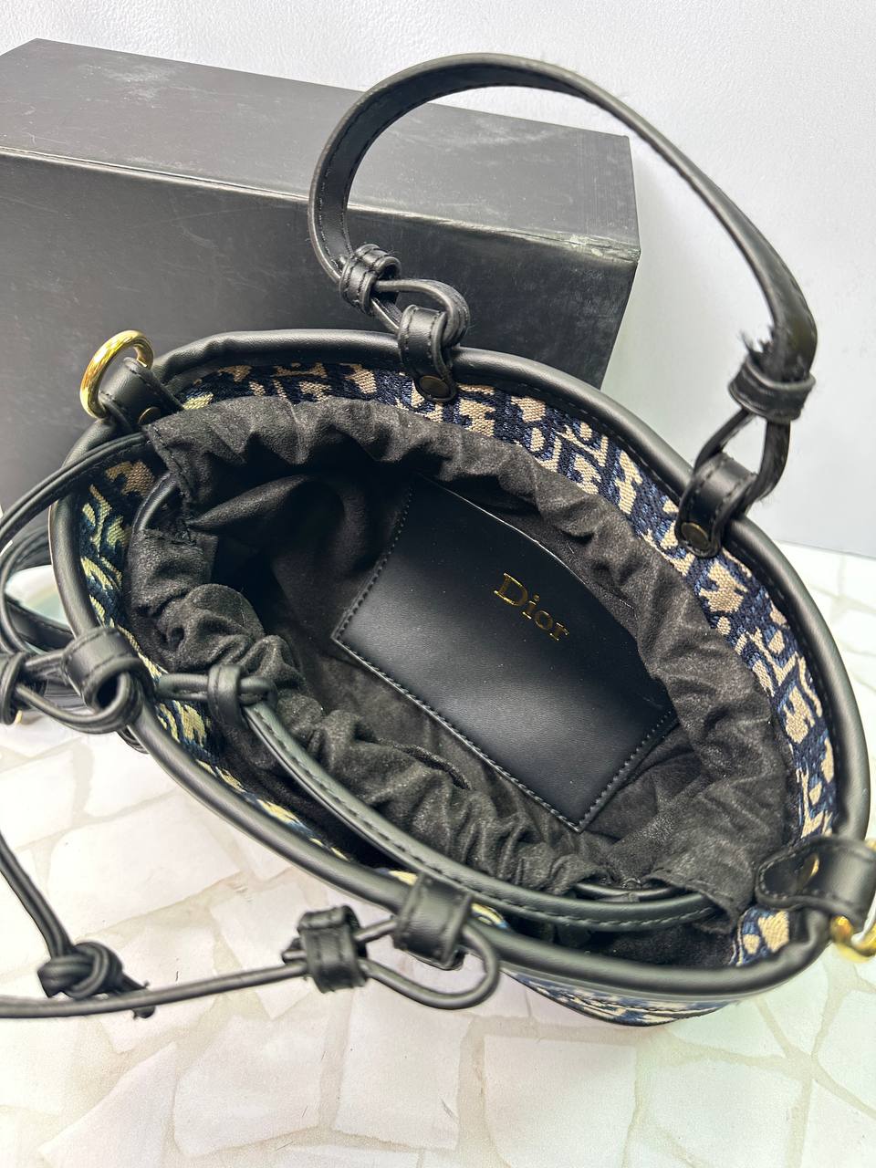 درون کیف با پارچهای باکیفیت پوشانده شده که لوگوی Dior روی آن دوخته شده است. این آستر علاوه بر ایجاد جلوهای لوکس، مقاومت داخلی کیف را افزایش میدهد و مانع ساییدگی یا آسیبدیدگی محتویات میشود.