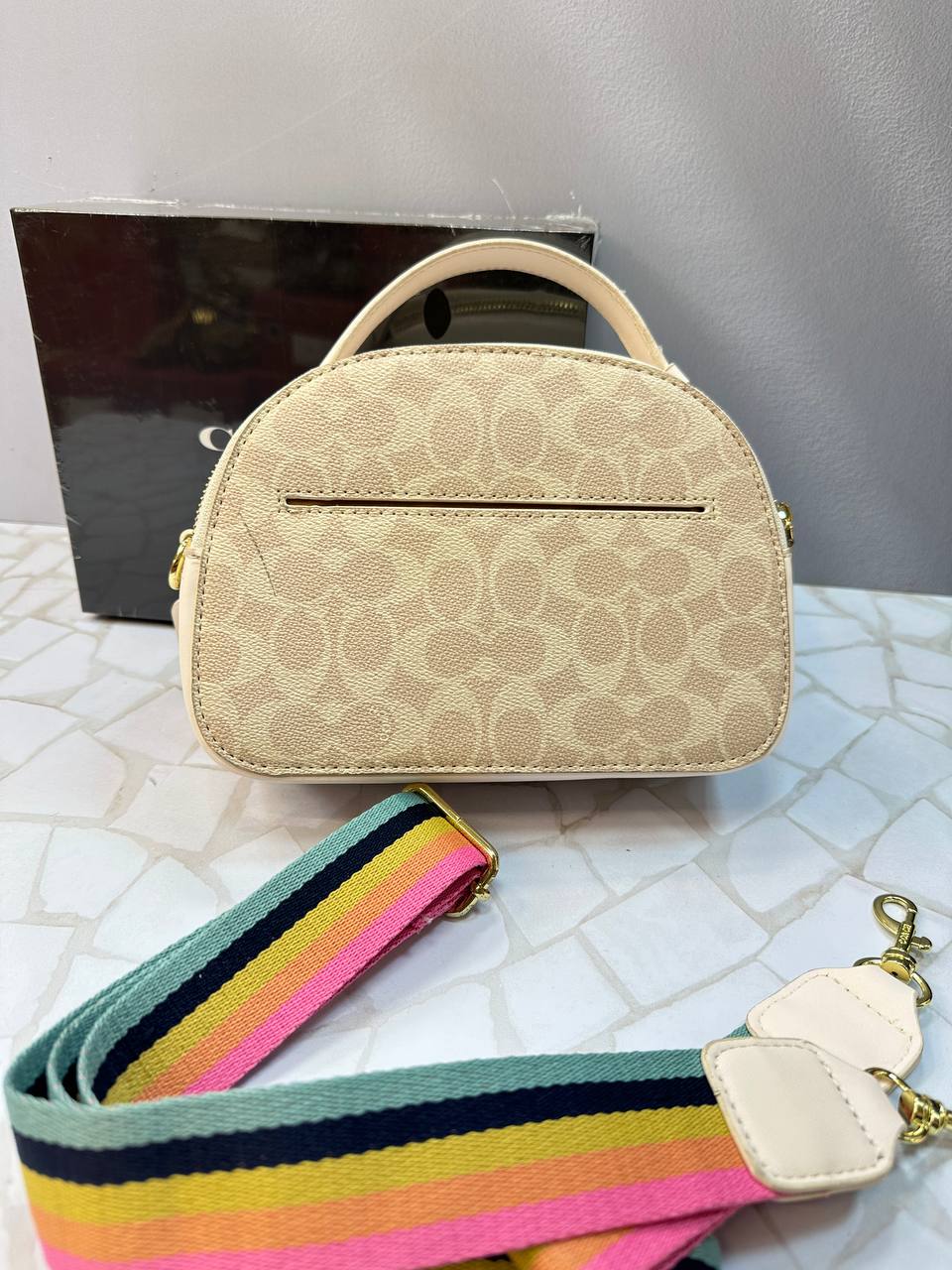 فرم بیضی‌شکل این کیف در عین جمع‌وجوری، فضای داخلی جاداری را فراهم کرده است. قسمت جلویی با لوگوی طلایی COACH مزین شده که جلوه‌ای لوکس و اصیل به کیف می‌بخشد.