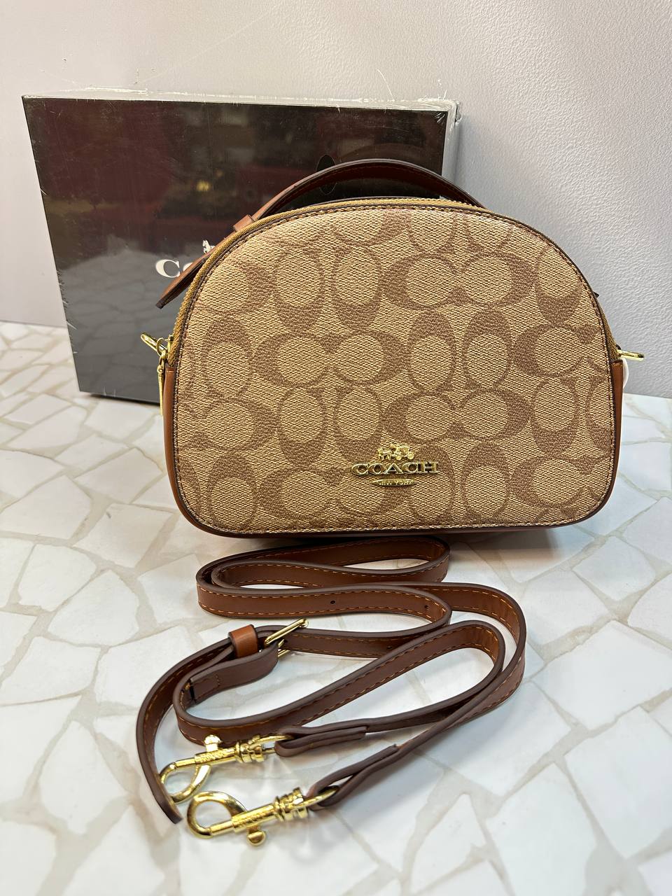 فرم بیضیشکل این کیف در عین جمعوجوری، فضای داخلی جاداری را فراهم کرده است. قسمت جلویی با لوگوی طلایی COACH مزین شده که جلوهای لوکس و اصیل به کیف میبخشد.