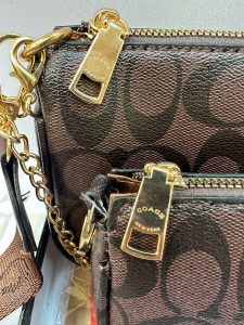این مدل از برند کوچ با ساختاری سهتکه شامل کیف اصلی، کیف کوچک جلویی و یک جاکلیدی دایرهای طراحی شده است. زنجیر طلایی براق در قسمت جلویی کیف جلوهای لوکس و مدرن ایجاد کرده و در عین حال به عنوان جزئی تزئینی پرکاربرد عمل میکند. طراحی چندتکه آن باعث شده تا کیف بتواند نیازهای مختلف بانوان را در موقعیتهای گوناگون برآورده کند.