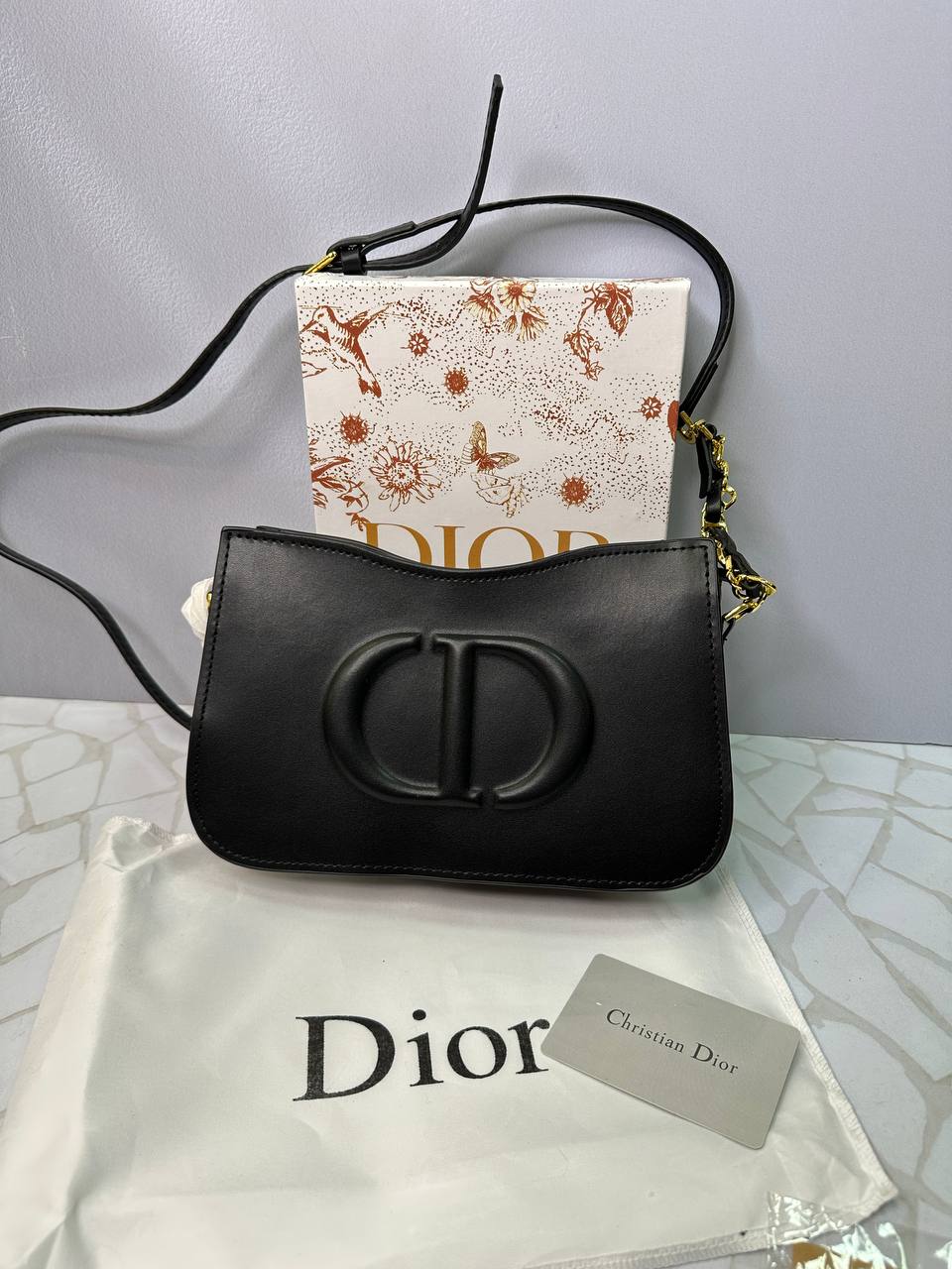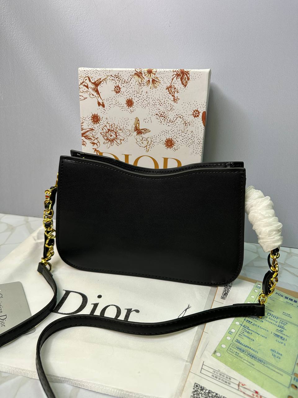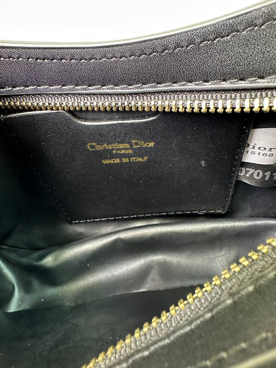 فضای داخلی کیف با وجود ابعاد باریک، نظم مناسبی برای استفاده روزانه فراهم میکند. در داخل آن یک جاکارتی کوچک تعبیه شده که نام Dior بهصورت چاپی روی آن دیده میشود. این بخش کمک میکند وسایل کوچک و کارتها بهصورت منظم و قابلدسترس نگهداری شوند.