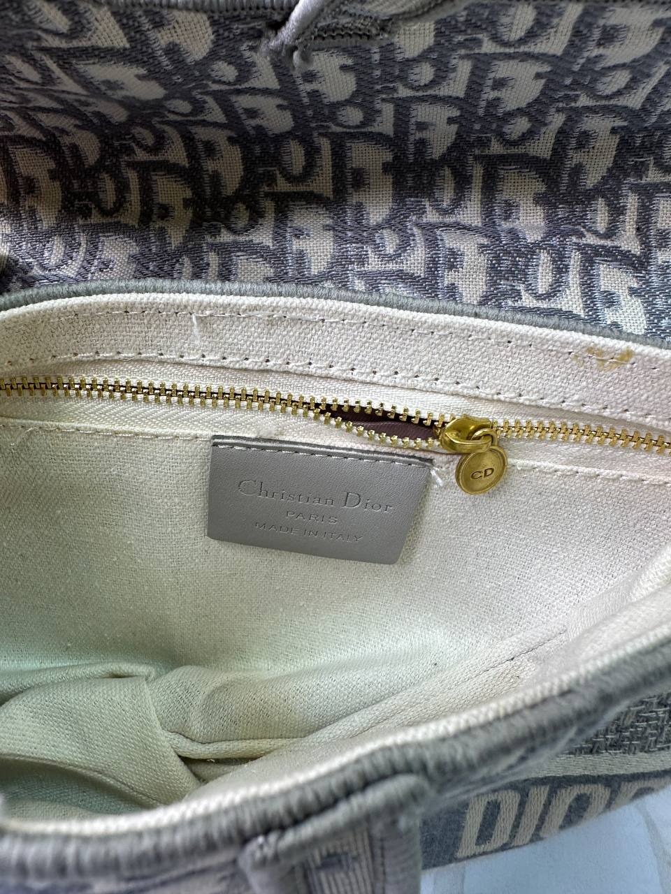 فضای داخلی کیف با پارچه سفید پوشانده شده و یک جیب ساده در بخش کناری قرار دارد. روی این جیب، یک تکه چرم مصنوعی دوخته شده که نام Dior روی آن حک شده و جلوه‌ای مرتب و رسمی به داخل کیف می‌بخشد.